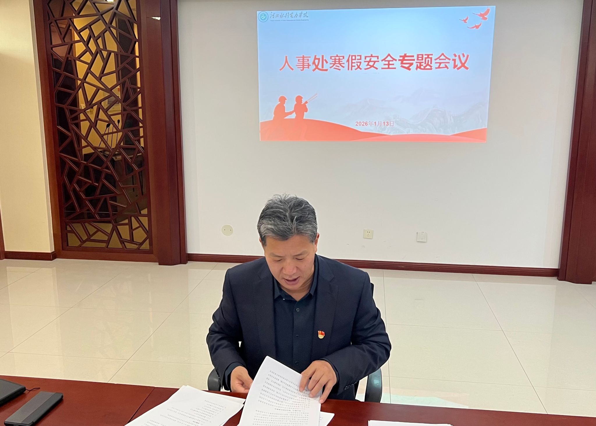 为筑牢寒假校园安全防线,做好寒假期间人事处安全稳定工作,2026年1月13日,人事处召开寒假安全工作专题会议,人事处全体人员参会,会议由人事处处长宋春初主持。